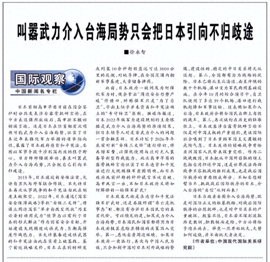 11月16日,《解放军报》发表了一篇名为《叫嚣武力介入台海局势只会把日本引向不归歧途》的文章,文章中明确表示如果日本试图插手台海事务,整个日本将有沦为战场的风险。这一警告无疑是中方对高市早苗近期表态的直接回应。高市早苗首次以首相身份公开宣称“台湾有事就是日本有事”,这句话的分量不容小觑,标志着日本在台湾问题上的立场开始向前迈出了一大步。