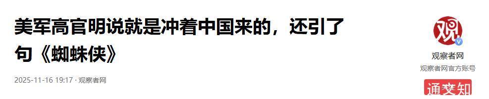 2025-11-16 19:17·观察者网 美军高官明说就是冲着中国来的,还引了句《蜘蛛侠》