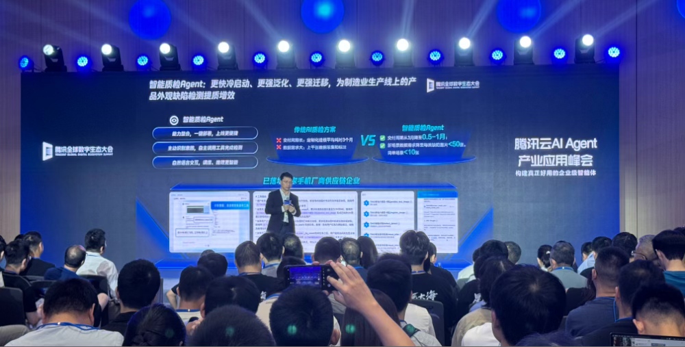 吴运声现场透露,腾讯智能体开发平台已在质检、巡检、媒体处理、酒店客服、政务办公、营销自动化等多个场景中落地。