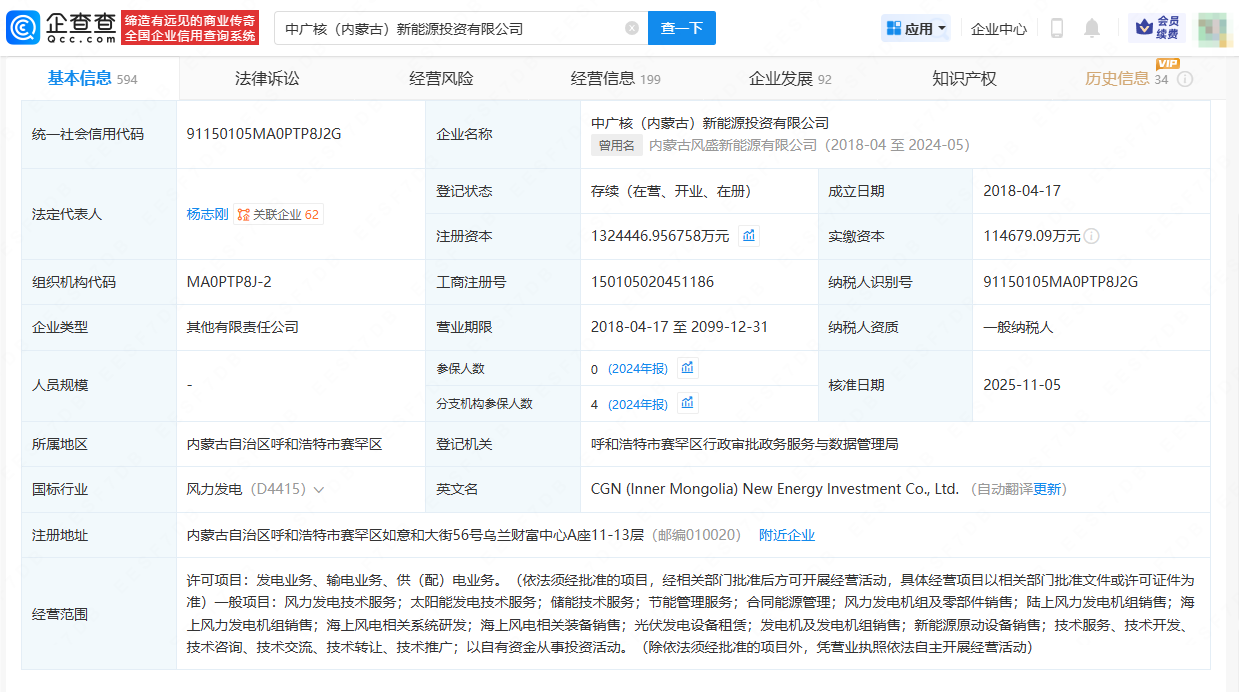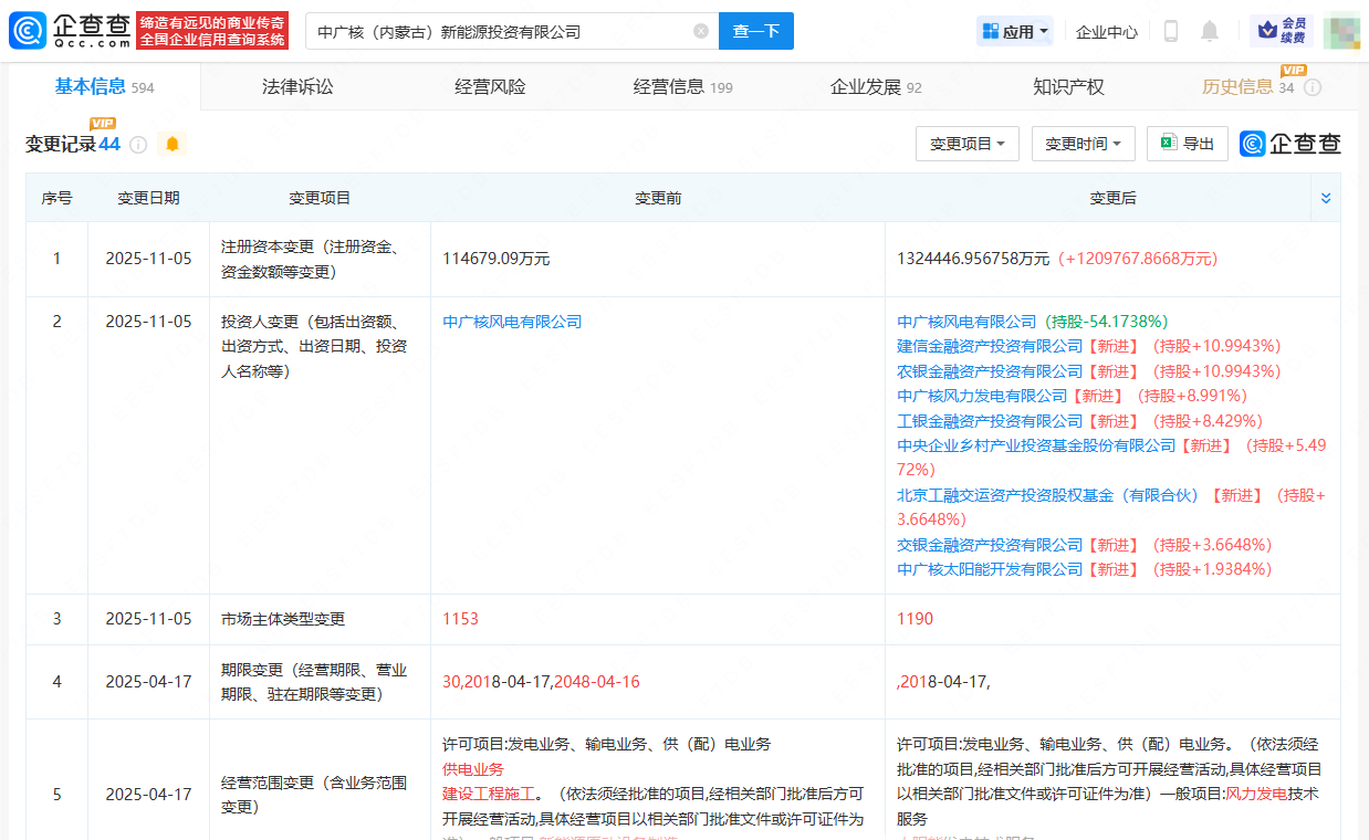 近日炒股配资配资平台,中广核(内蒙古)新能源投资有限公司发生工商变更,注册资本由约11.47亿增至约132.44亿元人民币,同时新增建设银行(601939)子公司建信金融资产投资有限公司、农业银行(601288)子公司农银金融资产投资有限公司、中广核风力发电有限公司、工商银行(601398)子公司工银金融资产投资有限公司、交通银行(601328)子公司交银金融资产投资有限公司等为股东。企查查信息显示,中广核(内蒙古)新能源投资公司成立于2018年4月,经营范围涉及风力发电技术服务、太阳能发电技术服务、储能技术服务、节能管理服务等。