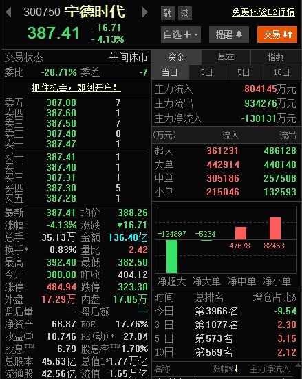 截至上午收盘,宁德时代股价报387.41元/股,跌幅4.13%,市值1.77万亿元。